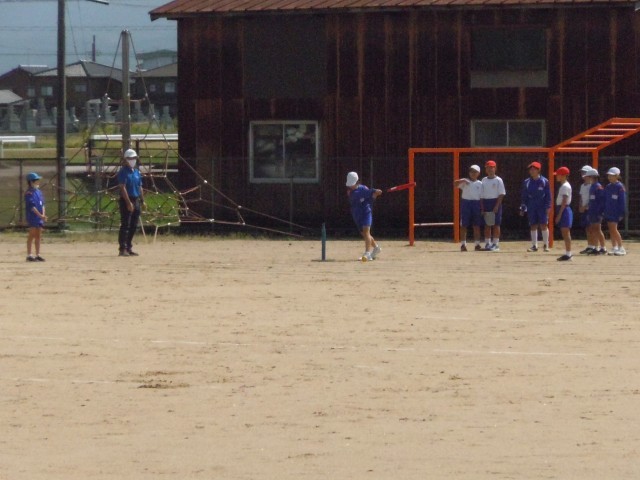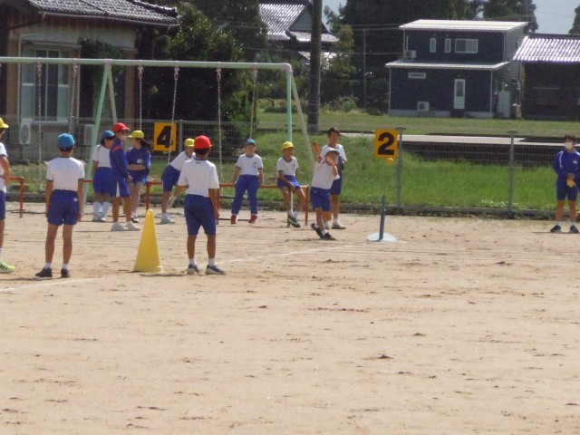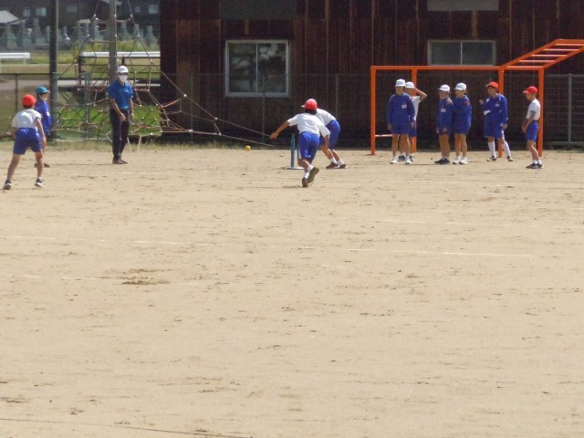 体育の時間です。ティーボールをしています。ボールが止まっているので、打ちやすい(?)はずです。守備がなかなか大変なようです。