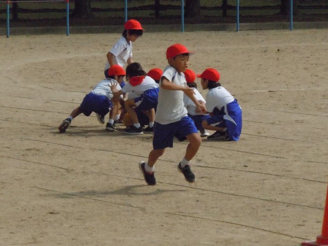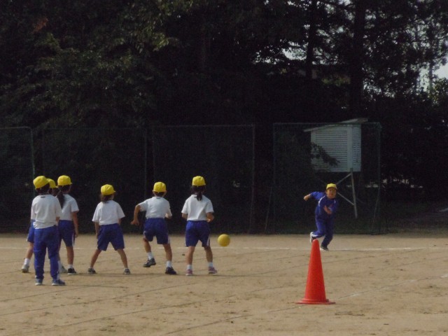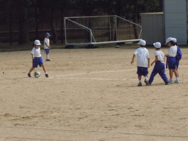 体育の時間です。ボールを蹴っていますが、サッカーではありません。蹴ったら走ります。他の人は、ボールに集まります。みんなが集まったところで走る人はストップしなければなりません。キックベースのもとになる動きをしています。