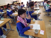 総合的な学習の時間です。先日稲刈りをしたバケツ稲のまとめに取りかかろうとしています。これまでの観察や活動のカードを開いて、振り返りをしています。
