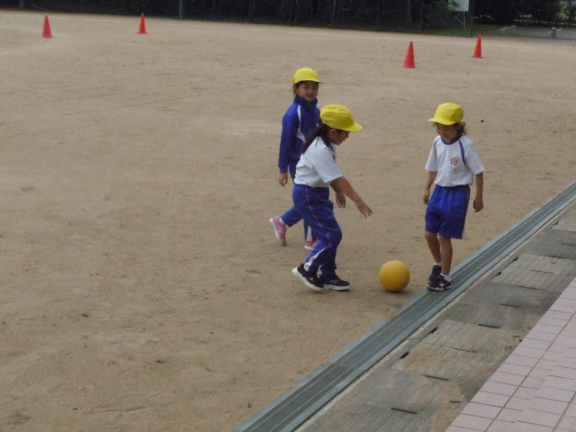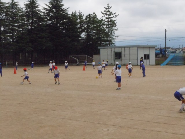 体育の時間です。グラウンドいっぱいに広がってボールを蹴っています。蹴る動きとボールが飛ぶ勢いや向きをコントロールできるようになりたいです。