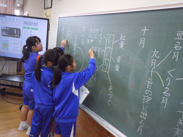 国語の時間です。秋の行事を表す言葉から、関連する言葉を集めています。季節の言葉を集めてくると秋の楽しさまで集めてくるような気持ちになります。