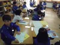 生活科の時間です。自分の生活を振り返り、友達に紹介しています。この後、家族の一員として自分のできることを考えていきます。