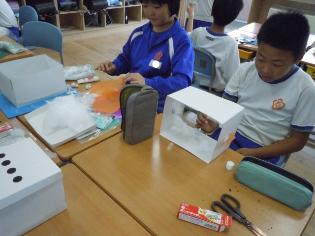 図画工作の時間です。「のぞくと広がるひみつの景色」を作っています。箱の中の世界が広がるように、仕掛けを工夫しています。小さく作ったり、光の入り方を工夫したり。出来上がりが楽しみです。