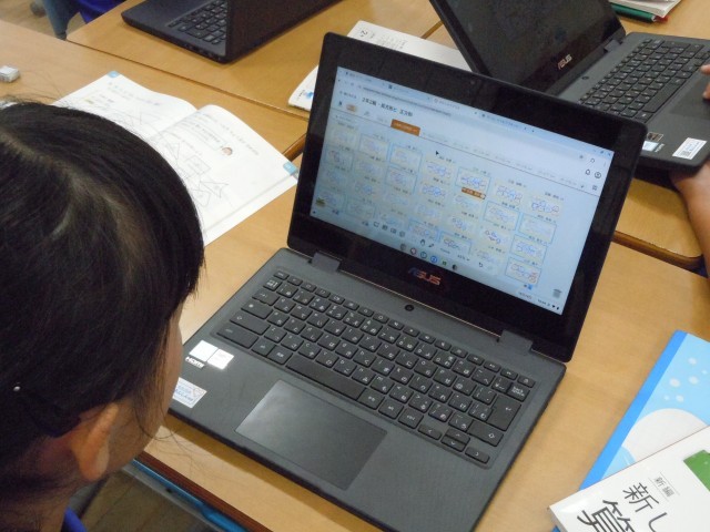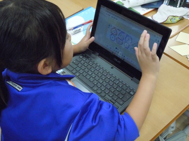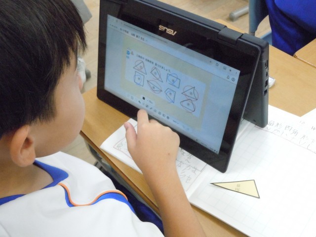 算数の時間です。今まで「さんかく」「しかく」と呼んでいた形と「三角形」「四角形」の違いを学習しています。自分で仲間分けした他bレット上のカードを友達の見比べて考えることもできます。自分と違う考えの友達に訳を聞いてみたくなります。