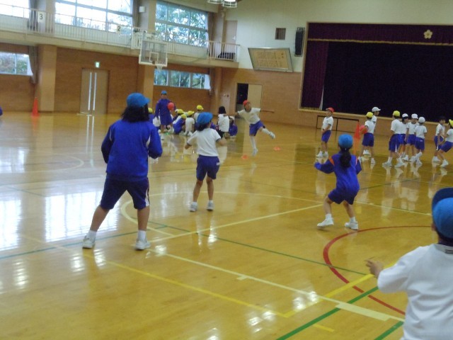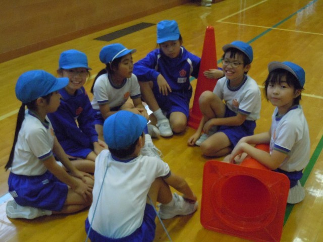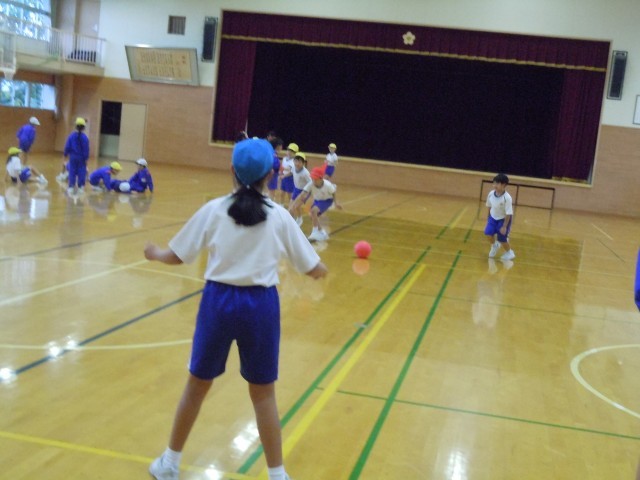 体育の時間です。本当は、外でやりたいキックベースですが、今日は、体育館でしています。強く蹴りすぎてもダメな様子です。作戦を考えています。