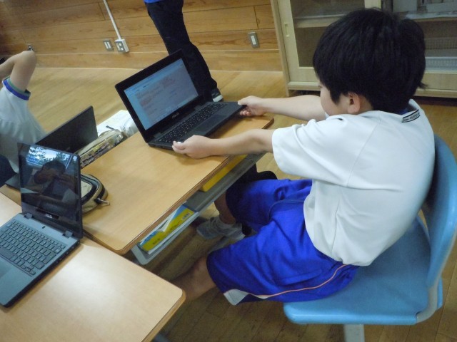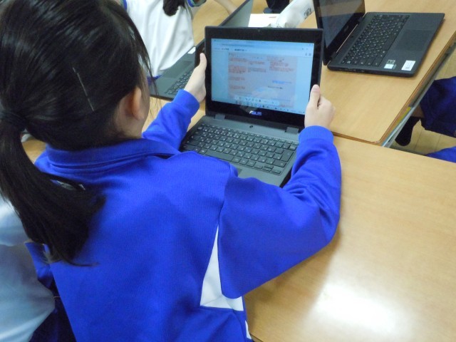 国語の時間です。「クラスみんなで決めるには」という学習で、クラスみんなで話し合った後、気づいたことをタブレットに書きこんでいます。全員の考えを書きこむことができ、考えの種類によって色を変えて書き込むので、みんなの考えが見て分かるようです。