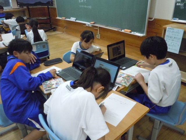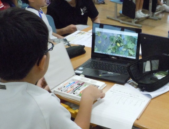 理科の時間です。涼しくなってきたこの頃の植物の様子をまとめています。真夏の記録をデータの中から取り出し、違いを比べています。