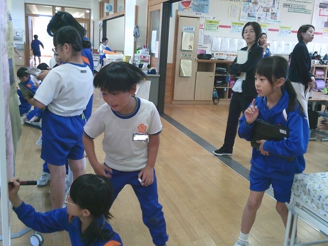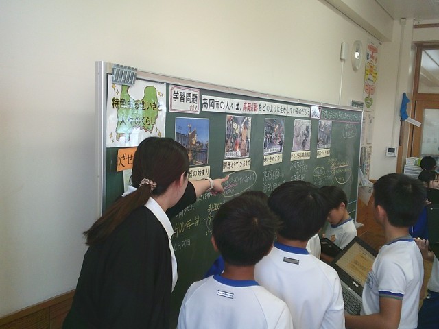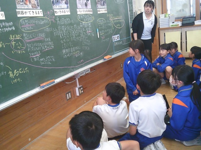 「高岡銅器の始まったころ」「祭り」「銅器づくり体験」等、子供たちが考えたい視点ごとに黒板に書き込みました。