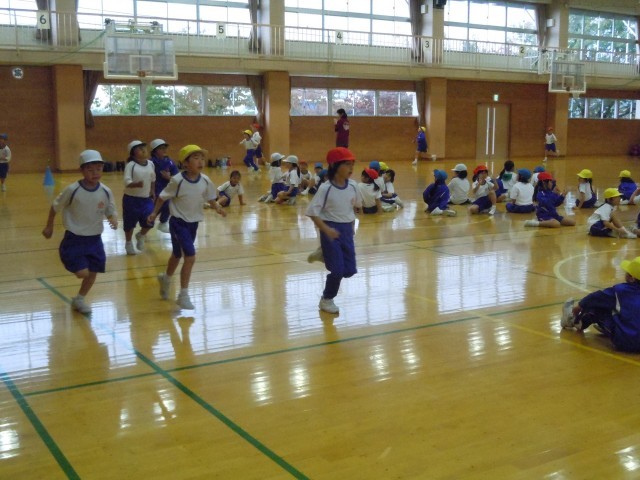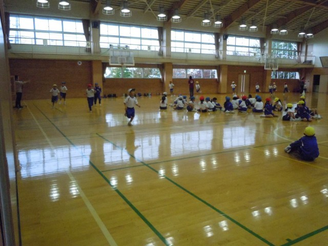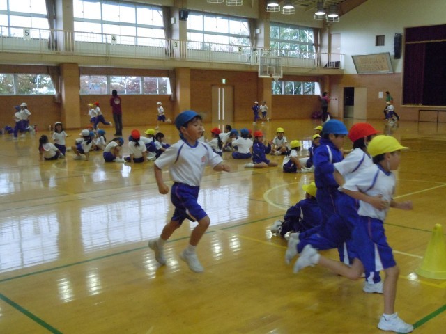 体育の時間です。今日の天気は雨。でも体育館で元気に走っています。応援する声も響き渡っています。