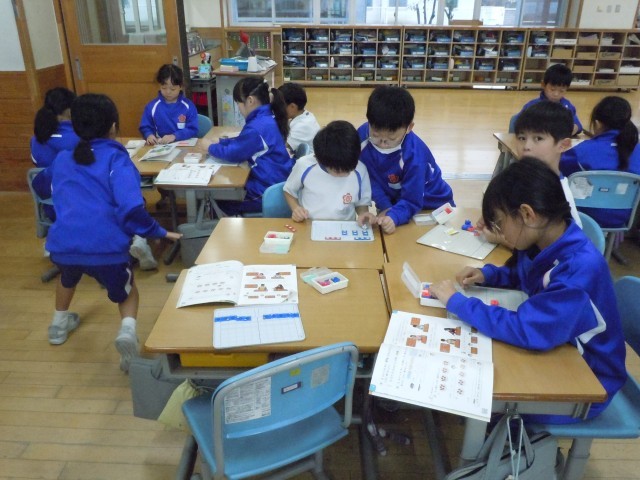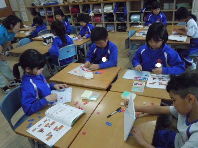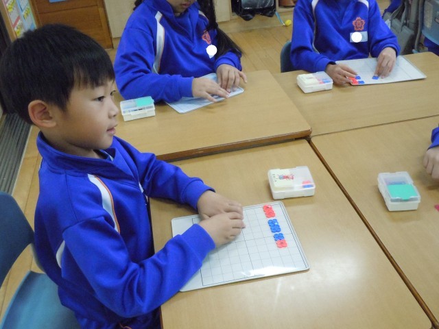算数の時間です。かけ算の学習をしています。おはじきでかけ算の式を表しています。