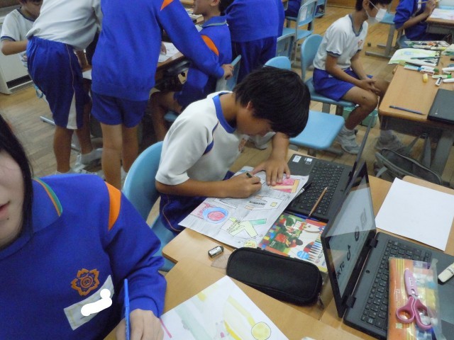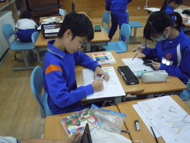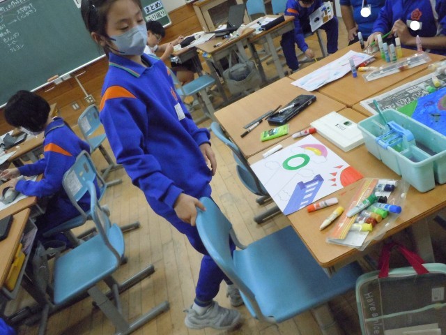 図画工作の時間です。「名前の町」という作品を描いています。漢字、アルファベットを自由に変化させて色使いを楽しんでいます。