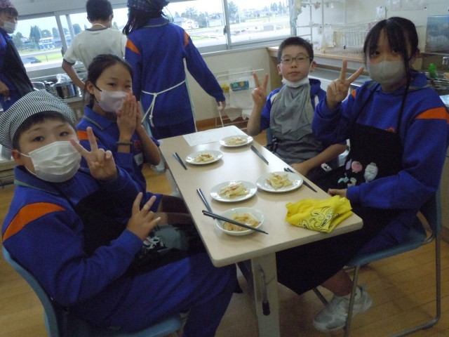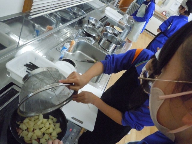 家庭科の時間です。ジャーマンポテトを作っています。とてもいい匂いがしている中、とても手際よく作っています。家でも、家族にごちそうしてほしいです。