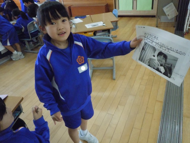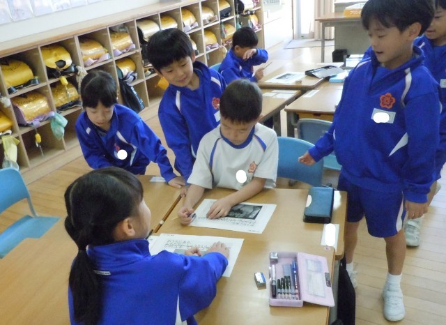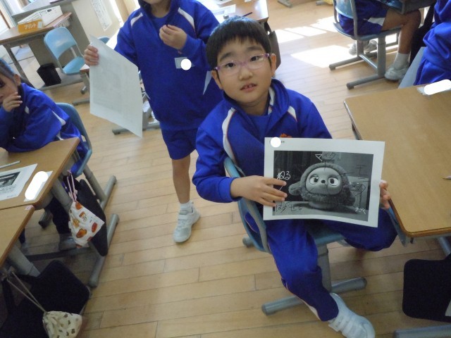 国語の時間です。みんなに紹介したい物の写真を撮ってきました。今日は、それに説明のメモを加えています。それをもとに説明する文を書きます。友達に見せたくてしょうがない様子です。