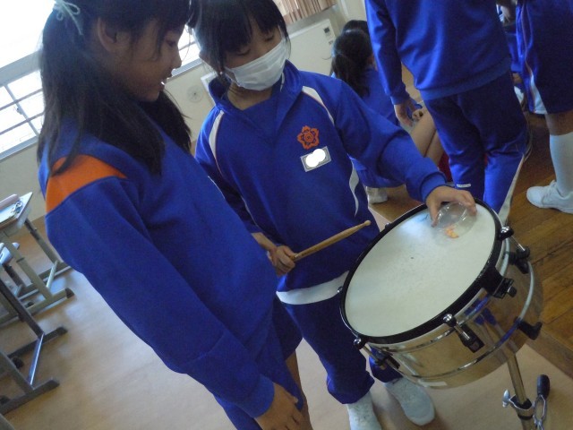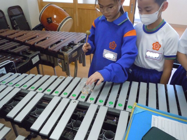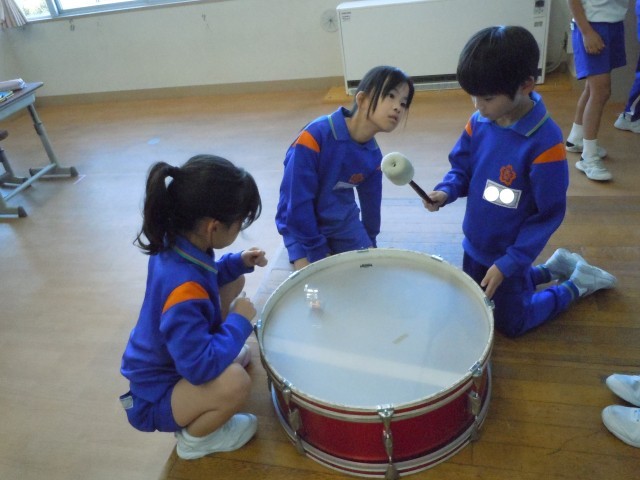 理科の時間です。輪ゴムギターをはじいて音を出すと、輪ゴムが震えていることを観察しました。今日は、音楽室でビーズを使って観察しています。音を鳴らすとケースの中のビーズが大きく飛び跳ねます。