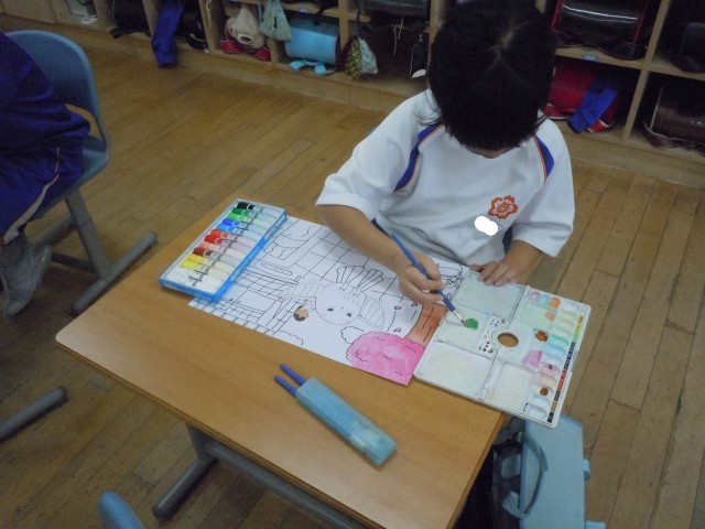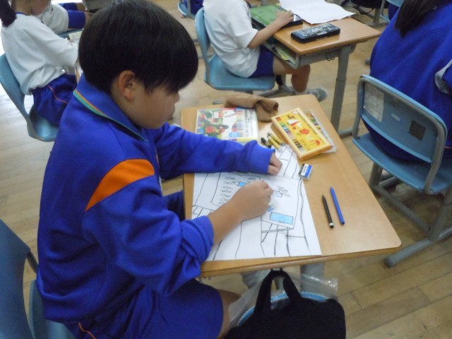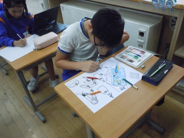 図画工作の時間です。自分が小さくなって遊びに行く設定です。夢中で取り組んでいます。