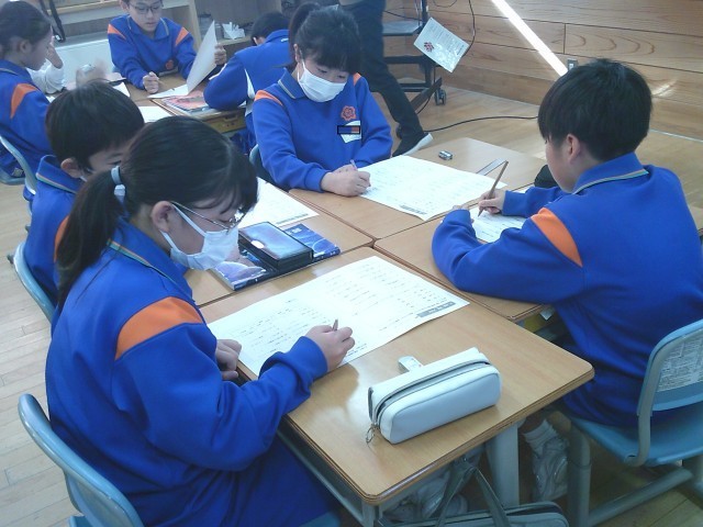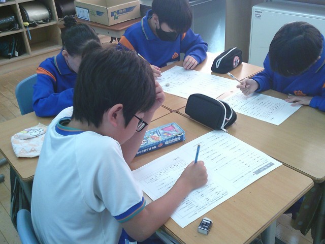 国語の時間です。和語、漢語、外来語を分けています。紛らわしいものは、友達と相談して考えています。