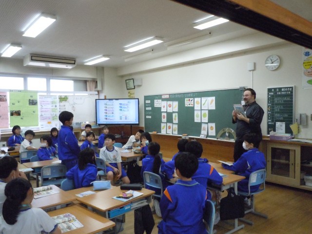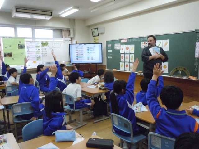外国語活動の時間です。果物や野菜の名前を言っています。カタカナになっている名前もあれば、英語の言い方の名前もあります。みんな意欲的です。