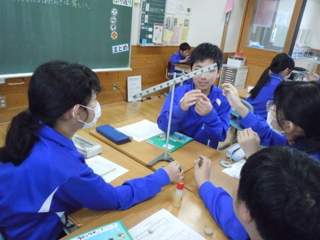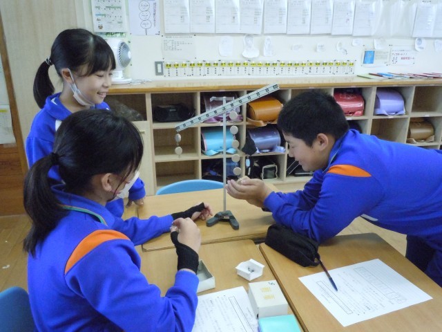 理科の時間です。天びんにおもりをつけ、どんなときつりあうのか調べています。予想しておもりをつけています。