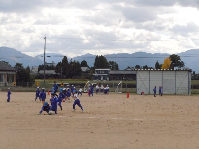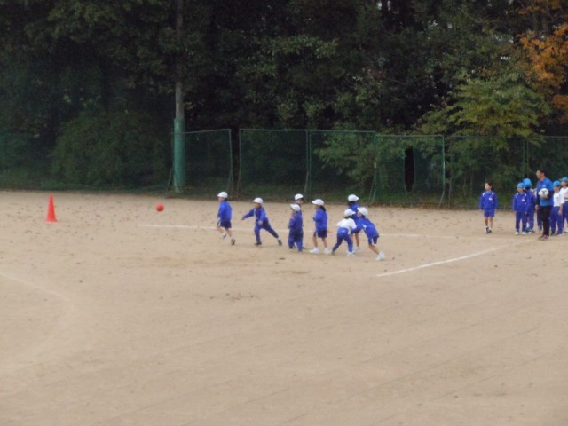 体育の時間です。キックベースボールをしています。少し前までは、守り方に工夫がみられましたが、今日は、守っている位置を見てボールを蹴る子供がみられるようになりました。必要に応じて集まって、作戦を確認しているようです。