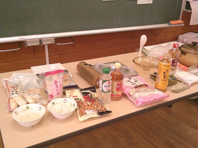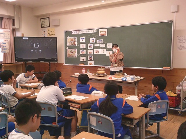 給食センターの方に、食に関する指導をしていただきました。お米を題材に、蒸したり挽いたりすると色々な食べ物に姿を変えることを学びました。子供たちは、別の食材も大変身をするのか、興味をもったようです。
