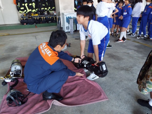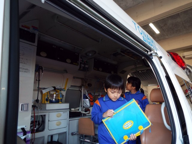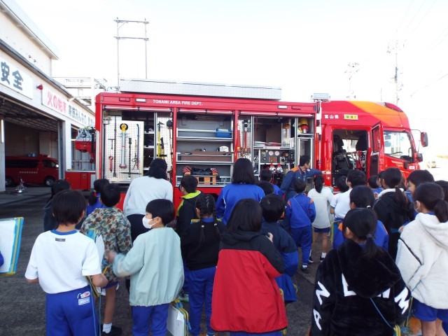 今日は1組が社会科の学習で消防署の見学に行きました。消防署の人たちが地域の安全を守るために、素早く出動できる準備をしていることや、日頃から訓練・点検などをしていることを学びました。普段は見れないような設備や、道具を触らせてもらって、よい体験になりました。