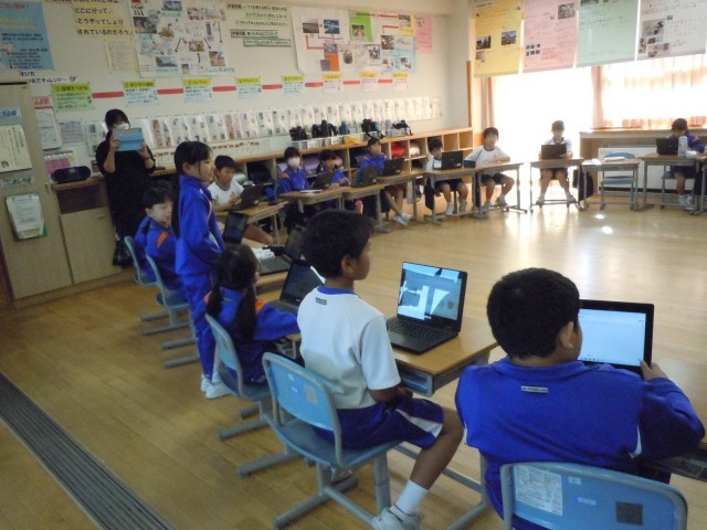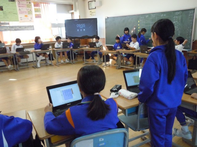 国語の時間です。話合いの仕方を学習したので、学級全員で話し合いをしています。一つの大きな円になってみんなの顔が見える状態で話し合っています。