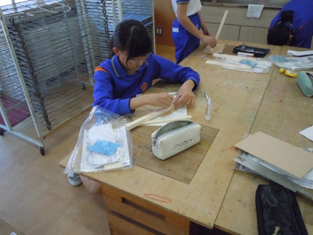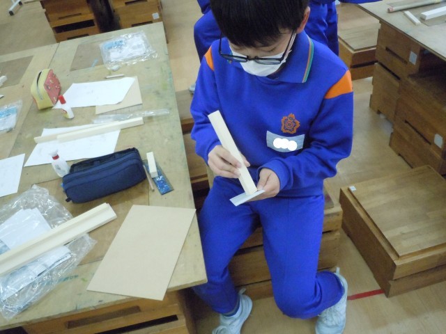 図画工作の時間です。木材と金属の材料を使って立体作品を作ります。設計図を描いて意欲満々で取り組んでいます。鋸やペンチなど上手に使いこなして思い通りに作りたいです。