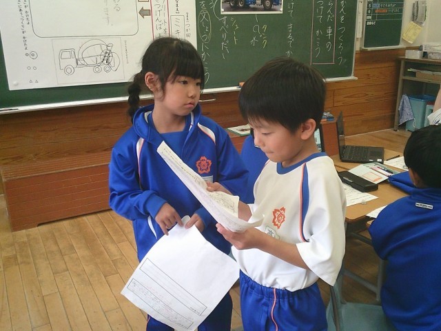 自分の選んだ車の「しごと」をするためにある「つくり」を紹介する文を書きました。書いた後は友達と発表し合い、正しい文章になっているか確かめていました。