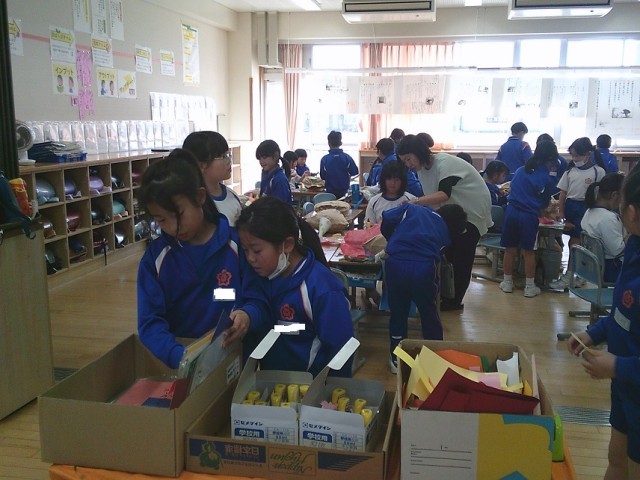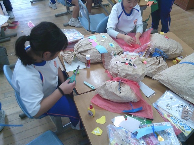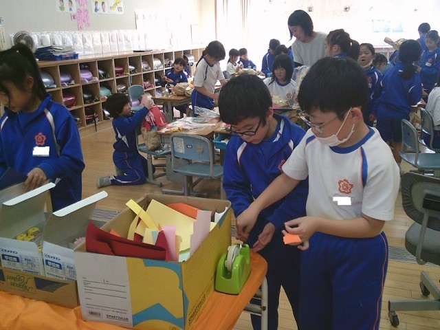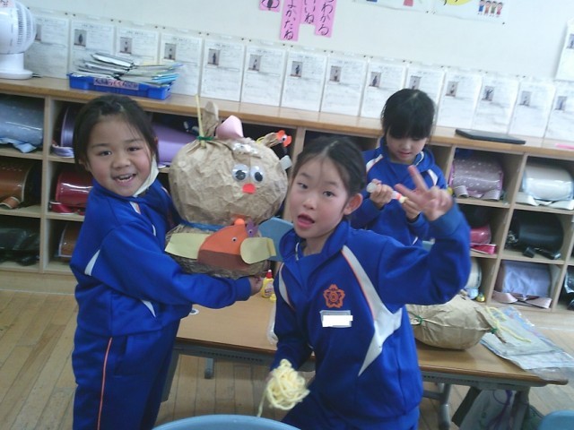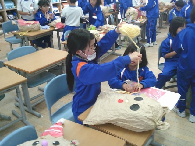 自分の表したい「お友だち」に合った材料を選び、作りました。最後にひもでぎゅっとして完成です。友達と相談したり協力したりして作っていました。