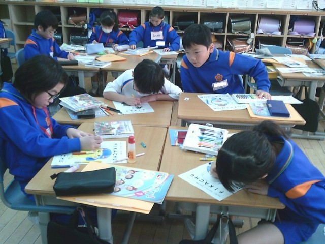 あらかじめ決めておいたぬり絵にかいてあるキャラクターのアルファベットをお店からもらってくる活動をしました。