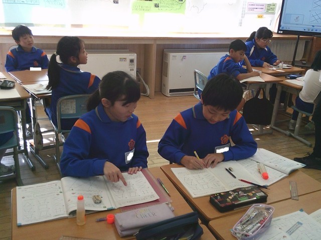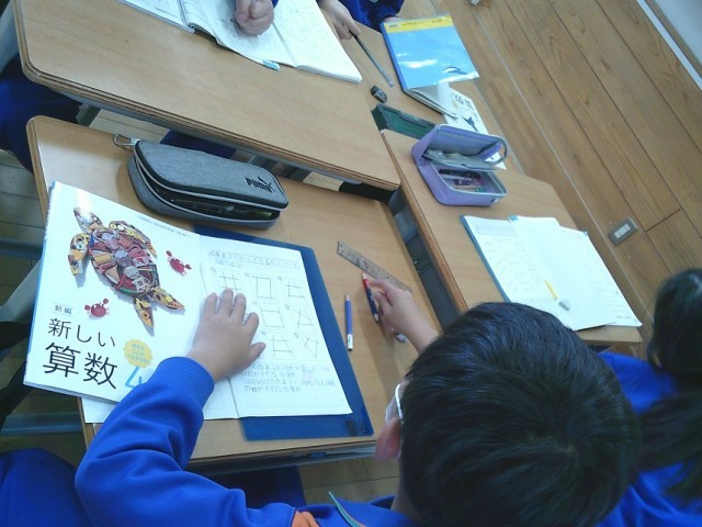 ノートの方眼を使うと簡単にかけることに気付き、楽しくいろいろな図形をかき、友達と見せ合っていました。