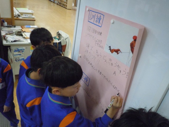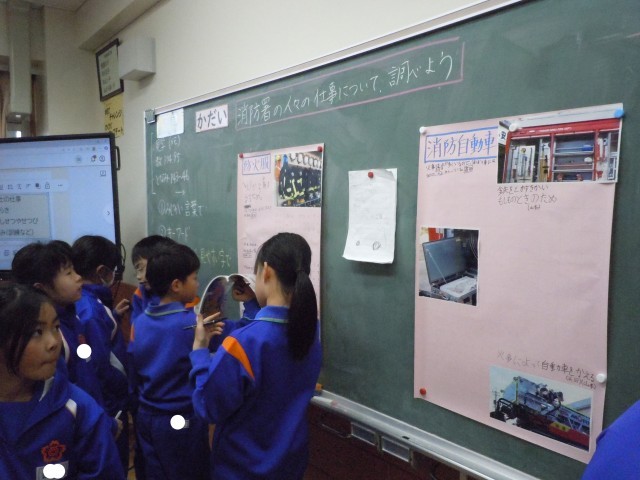 社会の時間です。消防署の仕事について調べています。見学したことや教科書をもとに友達と話しながらまとめています。