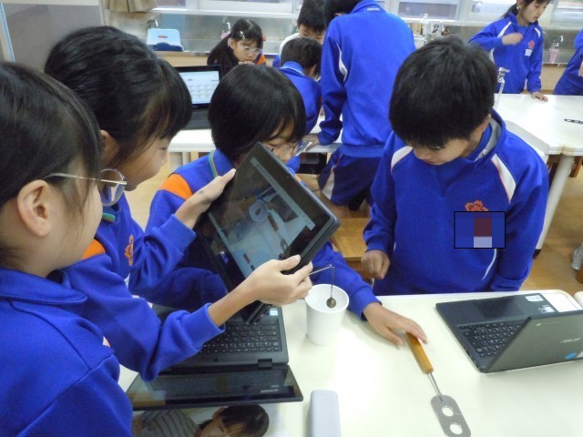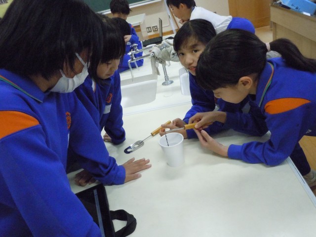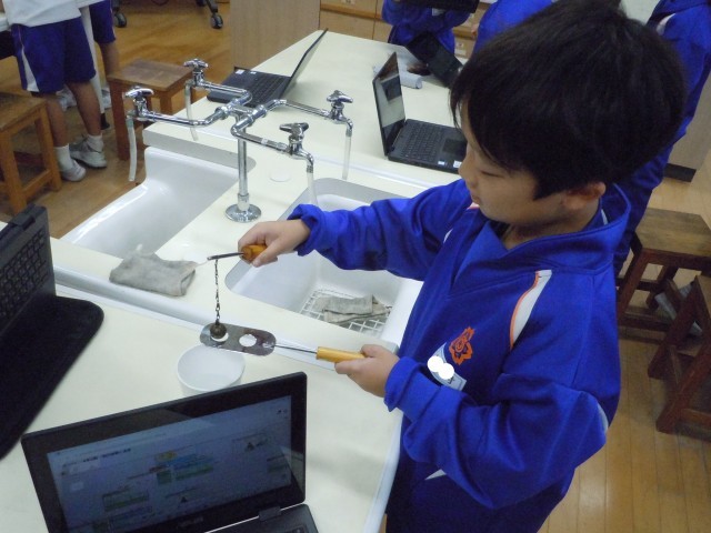 理科の時間です。金属を温めると体積はどうなるのか調べています。予想をしてから調べていますが、きちんと既習内容や生活経験に基づいて考えられることが大切です。