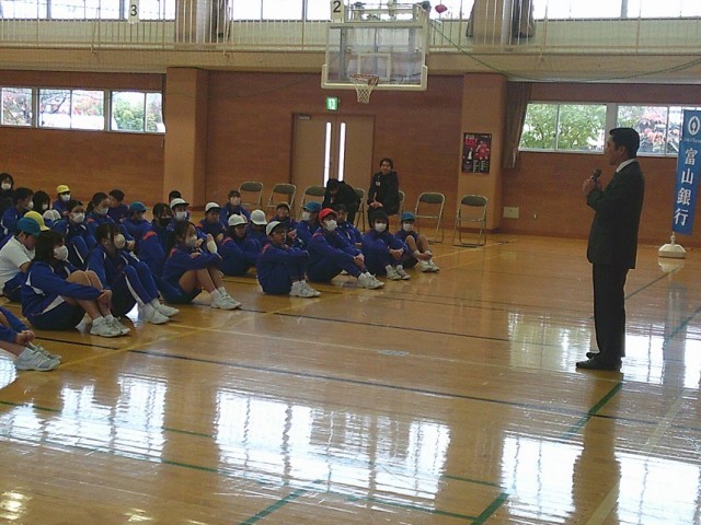 富山銀行砺波支店長の金田さんよりご挨拶をしていただいた後、森井泉コーチ、藤縄コーチ、葛原選手によるバスケットボール教室を行いました。