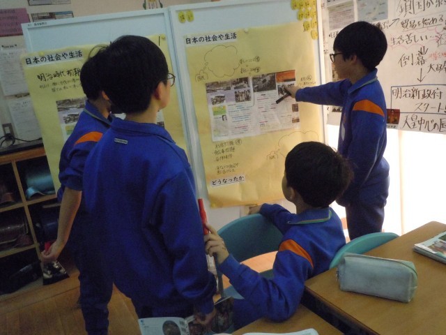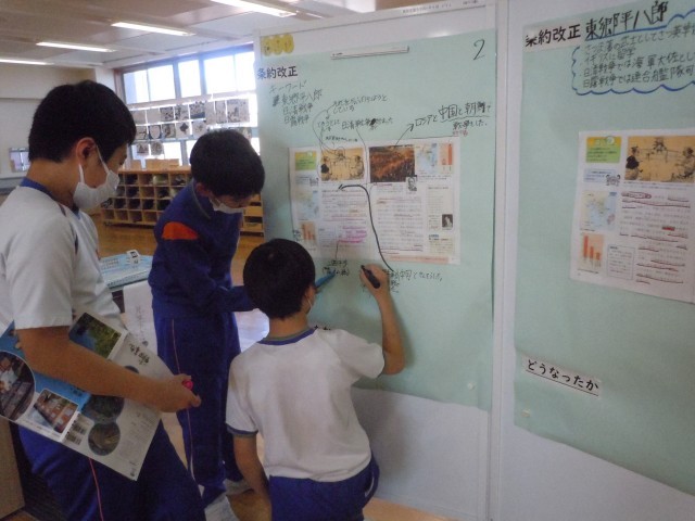 社会の時間です。明治の後半、日本はどのように条約を改正し、どのような世の中になったのか調べ、対話しながら考えています。資料の読み方も友達の説明から上手になっています。