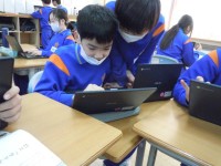 理科の時間です。手回し発電機で発電し、豆電球に明かりをつけています。ゆっくり回したり、速く回したりして回し方を変え、豆電球の明かりのつき方の変化を調べています。