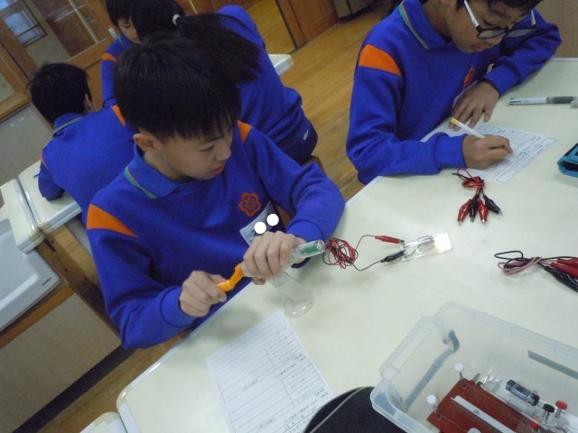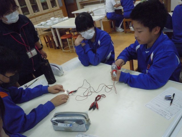理科の時間です。手回し発電機で発電し、豆電球に明かりをつけています。ゆっくり回したり、速く回したりして回し方を変え、豆電球の明かりのつき方の変化を調べています。