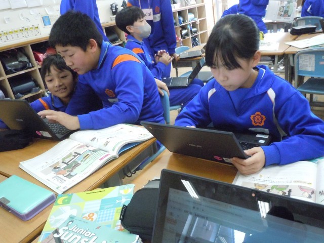 外国語の時間です。小学校生活1番の思い出をスピーチする準備をしています。ホームページ等で振り返ったして話す内容を決め、先生に話、内容を仕上げていきます。途中、ALTの先生にも聞いてもらい、質問されることで内容も膨らんでいくようです。