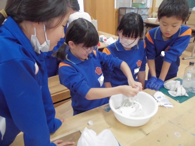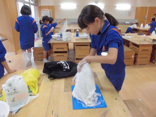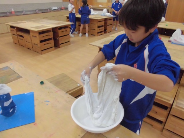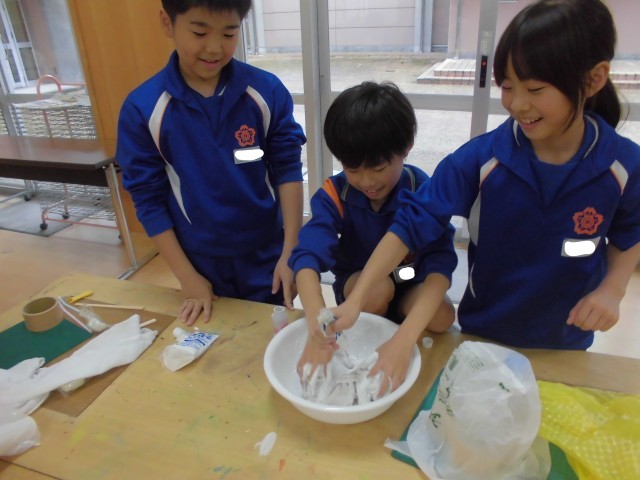 図工の学習で、液体粘土を使いました。最初は触るのをためらっていた子も、すぐに慣れて楽しそうに触っていました。