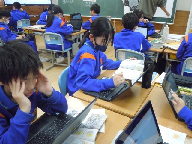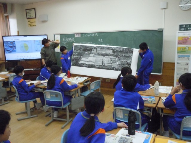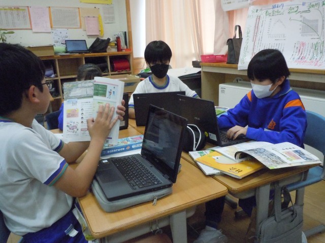 社会の時間です。日本の自動車工業について学び始めました。豊田市にある自動車工場の大きな絵を見ています。その大きさに驚いていますが、前の単元で話題にした食品ロスのことから学習問題を作る子供もいて、学んだことを生かして学習する姿に感心します。
