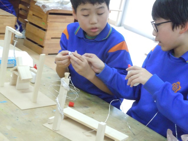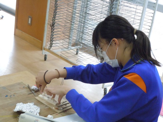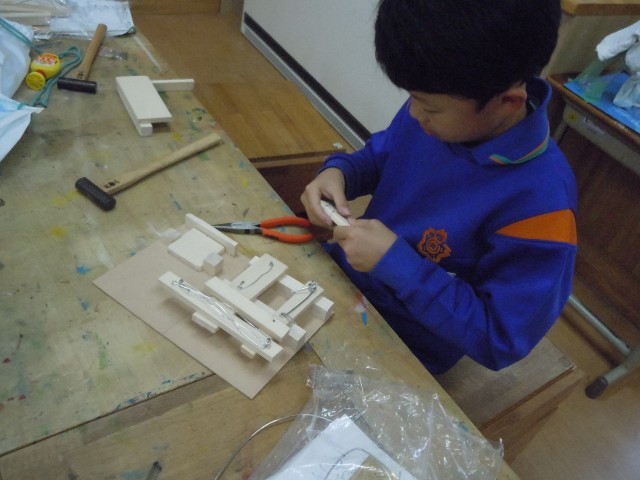 図画工作の時間です。木と金属を使って立体作品を作っています。思うように木を切ったり、金属を変形させたり、一人一人個性が出ています。