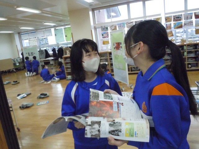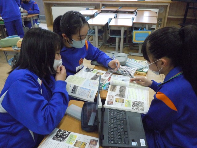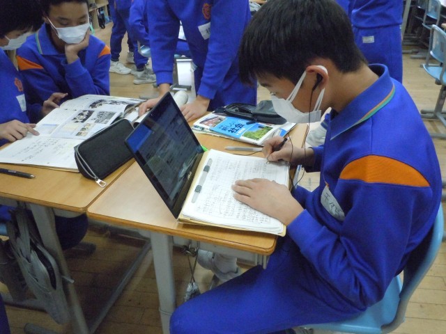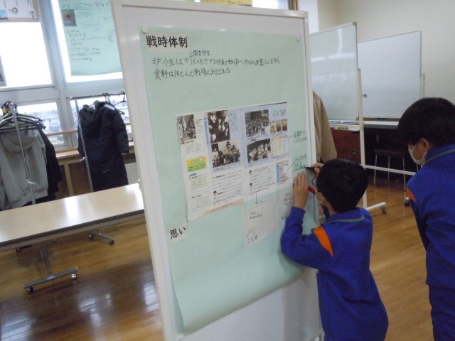 社会の時間です。学年で取り組んでいます。他のクラスの友達のよりよい学びを生かして取り組むことを目指しています。