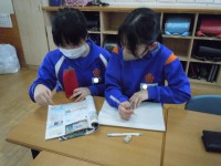 算数の時間です。平行四辺形の中に高さが記されてない平行四辺形の面積を求めています。どう考えれば面積を求められるのか、マス目からヒントを得たようです。
