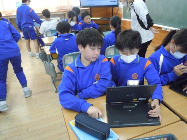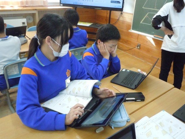 算数の時間です。平行四辺形の中に高さが記されてない平行四辺形の面積を求めています。どう考えれば面積を求められるのか、マス目からヒントを得たようです。