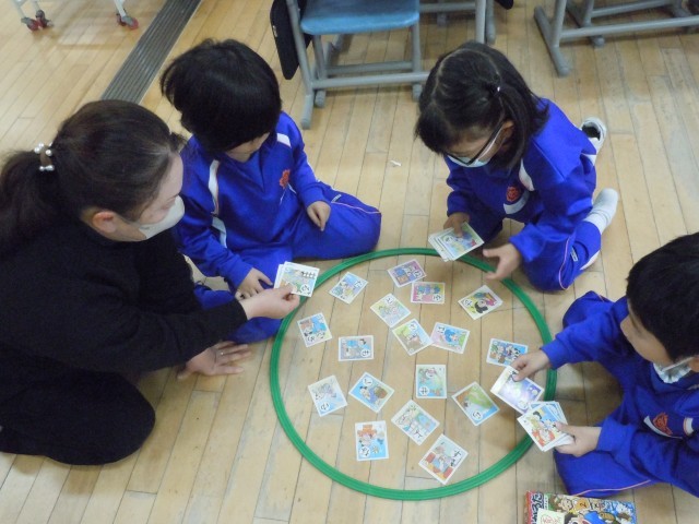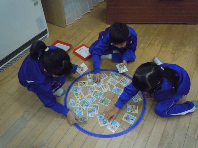 国語の時間です。かるたをしています。犬棒かるた(ことわざかるた)です。これから腕を上げていきます。