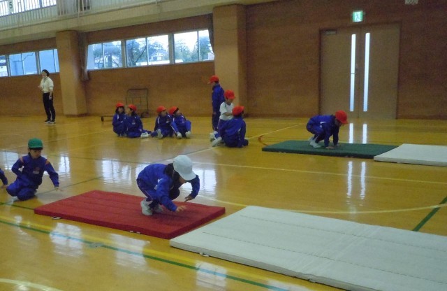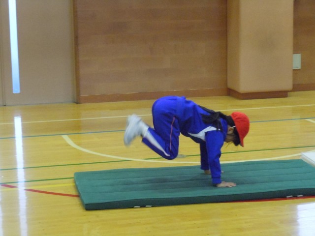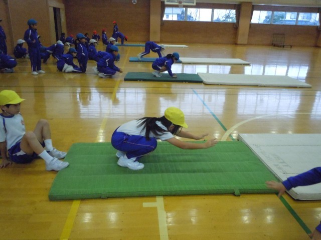 体育の時間です。マット運動に取り組んでいます。体をしっかりと支え、逆さまになっても自由に体をコントロールできるようにうさぎのようにうさぎ跳び、うさぎ跳びをしながら足裏で拍手する動きをするかえる跳びをしています。簡単そうに見えて、こつが必要なようです。