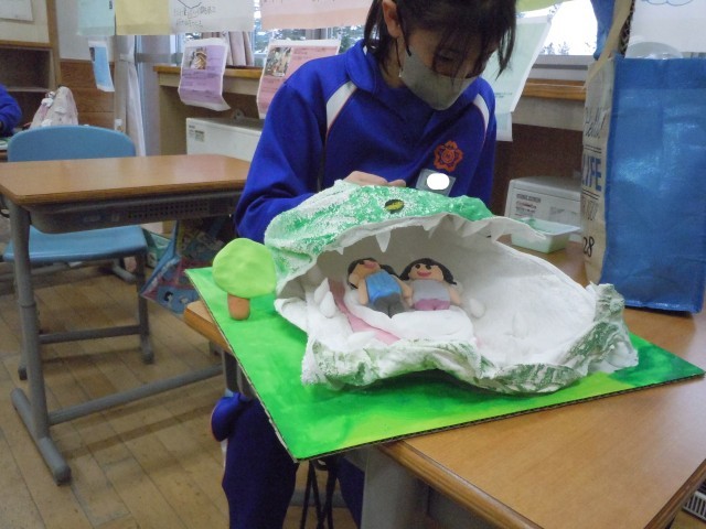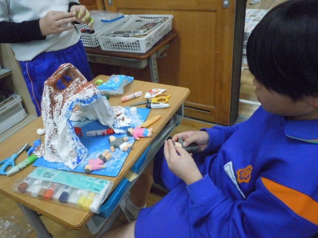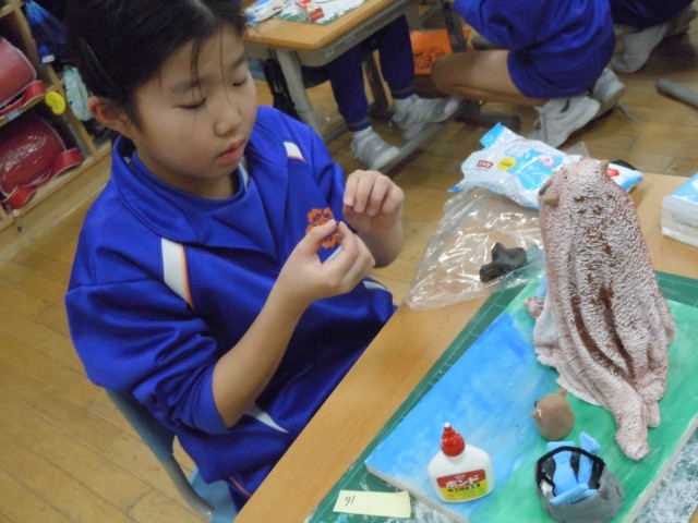 図画工作の時間です。液体粘土で固めた布から自由に発想して作品を作っています。固めた時の形から山に見立てる子供が多い中、倒して考えたり、穴になってへこんだところを面白くイメージを広げたりする姿がみられます。楽しそうです。