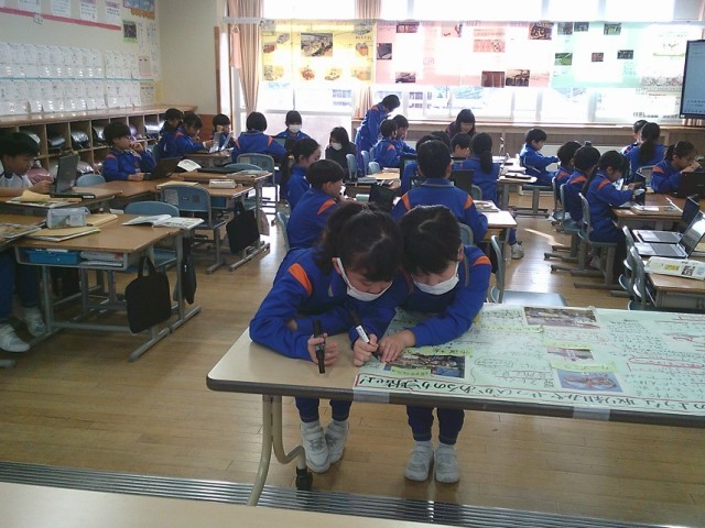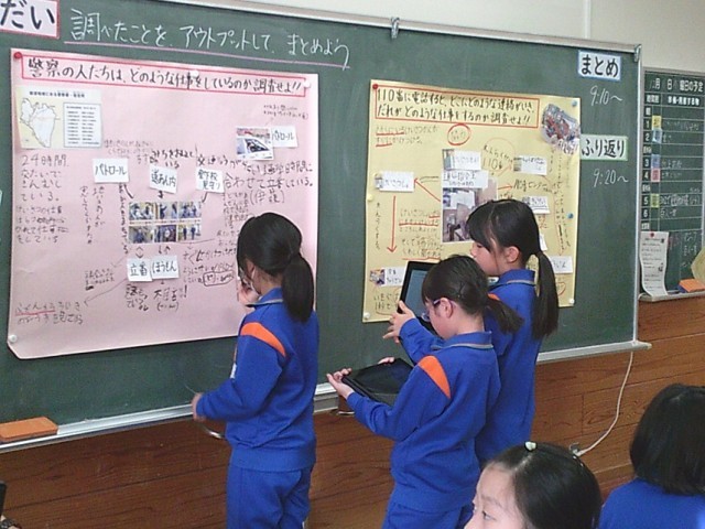 警察の仕事や、情報が伝わる仕組み等について調べたことを友達に伝えたり、模造紙に書き記したりする活動を通して、考えを深めていました。いろいろな考えをもった友達と対話を楽しみながら取り組みました。