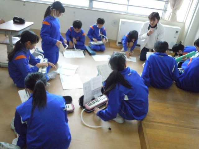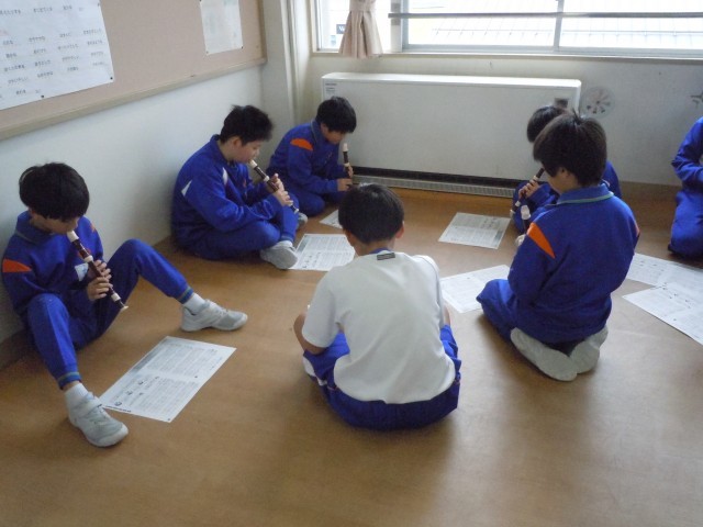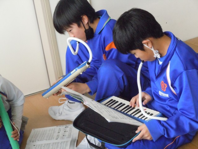 音楽の時間です。「キリマンジャロ」を合奏しようと練習しています。曲を聞いた瞬間に楽しい気分になり、体が動いていました。リコーダーと鍵盤ハーモニカを選んで練習しています。友達と集まって練習すると、分からないところが分かって早く上手になるようです。