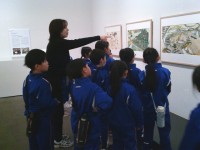 図画工作の時間です。カッターの扱いに慣れてきた子供たちは、窓のある建物を次々つくっています。表裏色が違う厚紙でつくっているので、2色4色6色と色が増えとてもカラフルです。
